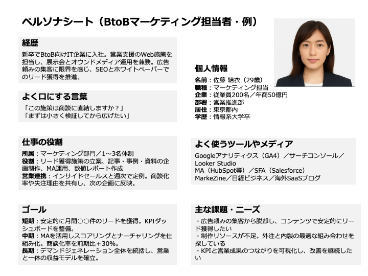 既存の自社商材について「架空の人物像をペルソナに落とし込むのが難しい」という場合は、既存顧客の担当者をペルソナとする方法もあります。